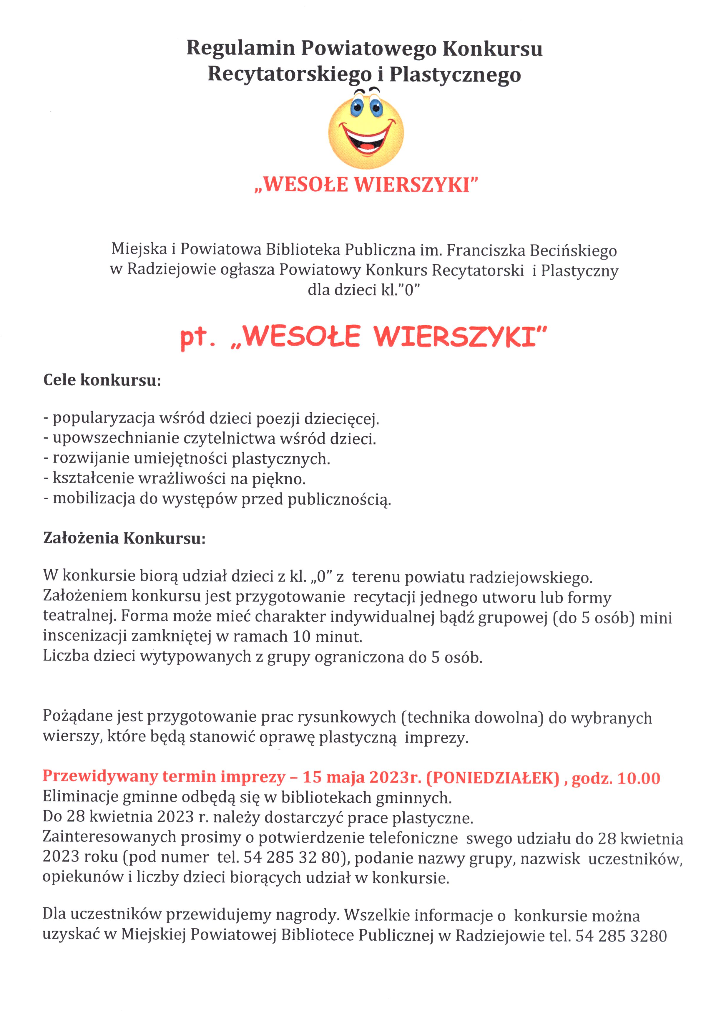 Miejska i Powiatowa Biblioteka Publiczna im. Franciszka Becińskiego w Radziejowie ogłasza Powiatowy Konkurs Recytatorski i Plastyczny