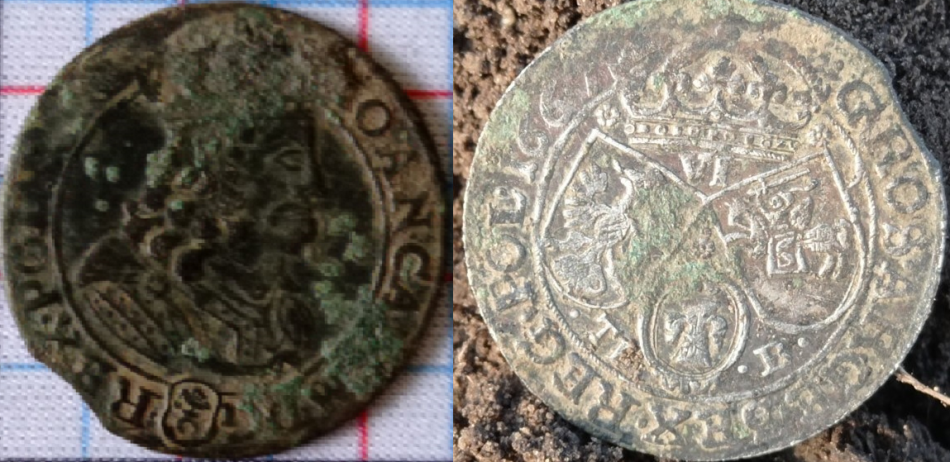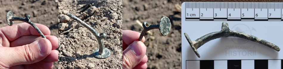 KAMIENNA SIEKIERKA z okresu Neolitu, która może liczyć około 5-6 tysięcy lat. Kamienna siekierka (5,8 x 3,2 cm) z okresu Neolitu, czyli młodszej epoki kamienia – epoki kamienia gładzonego, może mieć nawet około 5 - 5,5 tys. lat. Znaleziona podczas współnych poszukiwań przez Małgorzatę Szymkowiak (pole orne w Radziejowie). Sierp z brązu z charakterystyczną m.in. dla tego materiału zieloną patyną, datowany na 1200-1000 p.n.e. (kultura łużycka). Szpila uchata z młodszej epoki brązu, służyła do spinania szat i można ją datować na około 1000 p.n.e., czyli ma 3000 lat. Fragment SZPILI HOLSZTYŃSKIEJ z brązu - służyła do spinania szat. Można ja datować na 2. połowę III wieku p.n.e., lub na początki II w. p.n.e. i w tym czasie łączyć należy z aktywnością na terenie Kujaw, ludności kultury jastorfskiej. Podzcas poszukiwań w okolicy Radziejowa :) "Jak to jest, że jest się tym, kim się jest?" Denar z okresu REPUBLIKI RZYMSKIEJ, którego można datować na II w. p.n.e., a dokładniej chyba został wybity w 104 r. p.n.e. w mennicy w Rzymie. Na awersie głowa ROMA w hełmie, na rewersie Saturn w kwadrydze. Denar z okresu REPUBLIKI RZYMSKIEJ, wybity w mennicy w Rzymie w 90 r. p.n.e., a więc ma ponad 2100 lat. Na awersie widzimy głowę Apolla w wieńcu laurowym, a na rewersie Minerwę w kwadrydze (piękne są te cztery koniki). Fragment SZPILI HOLSZTYŃSKIEJ z brązu, fibula z wyobrażeniem zwierzęcia (rogi - wół, byk), na dole cała fibula ze spężynką i igłą, oraz dwa srebrne denary rzymskie z II w. cesarzowej SABINY, (żony cesarza Hadriana) i denar cesarza KOMMODUSA. Srebrne denary rzymskie z I i II w. n.e. a więc mają prawie 2000 lat. U góry denar cesarza Kommodusa ze stojącym, nagim Geniuszem na rewersie, na dole po lewej - denar cesarza Domicjana, a po prawej - denar cesarza Trajana. Rzadko znajdowany denar rzymski cezara Aeliusza. Wybity w mennicy w Rzymie w 137 r. n.e., na awersie popiersie cezara i napis w otoku AELIVS CAESAR, a na rewersie siedząca Concordia, trzymająca paterę, za nią róg obfitości. DENAR LEGIONOWY cesarza Septymiusza Sewera. Moneta została prawdopodobnie wybita w 193r. n.e., w Rzymie, a na jej rewersie widzimy orła legionowego (aquila) między dwoma sztandarami wojskowymi – znakami legionowymi. Denar rzymski cesarza Maksymina Traka, panował w latach 235 - 238. Fibule (zapinki) z Okresu Wpływów Rzymskich, które można datować na II wiek a więc mają ponad 1800 lat. Wykonane są z brązu i służyły do spinania szat (ubrań). Rozmiar fibul to 3,5 - 4cm. Srebrna fibula (zapinka do szat - pełniła także funkcje ozdobne) z okresu wpływów rzymskich, którą można datować na 2 poł. II w. lub 1 poł. III w. n.e. Denar koronny Władysława III Warneńczyka wybity w mennicy krakowskiej w latach 1434-1444. Szeląg krzyżacki z XV wieku, którego znalazłem podczas budowy Muzeum w Płowcach. Pierwszy sygnał w ziemi wykopanej pod fundamenty muzeum okazał się piękną monetą. Szeląg gdański Kazimierza IV Jagiellończyka, czyli srebrna monetka z 2 poł. XV wieku. Na poszukiwaniach nie jestem święty ale się staram, nawet aureola dzisiaj się pojawiła. Szóstak koronny Zygmunta III Wazy (czyli sześć groszy), wybity w mennicy w Krakowie w roku 1627. Srebrna moneta – szóstak koronny czyli sześć groszy Jana II Kazimierza Wazy z 1667r. Widoczny nominał monety VI oraz herby Polski, Litwy i Wazów. Srebrna kopiejka (łezka), cara Piotra I, wybita w Moskwie, w 1702r. Różne znaleziska od starożytności aż po wiek XIX. Medalik religijny z napisem ROMA, wyprodukowany w mennicy papieskiej w Rzymie, który prawdopodobnie można datować na koniec XVII lub wiek XVIII, widzimy Św. Annę (matkę Maryi) i samą Maryję oraz aniołów adorujących Najświętszy Sakrament. Wykrywacz metali, saperka i plecak to podstawowy sprzęt poszukiwacza. Oczywiście przydaje się też „odrobina” wiedzy i szczęścia. Pieczęć a poprawnie mówiąc tłok pieczętny z herbem DĄBROWA i inicjałami SMM, który można datować na XVI lub przełom XVI i XVIIw. Pierwsze dwie litery w inicjale pochądzą od imion a trzecia od nazwiska szlachcica, który tego tłoka pieczętnego używał Carski tłok pieczętny (potocznie nazywany pieczęcią) z okresu zaborów, związany z dawnym młynarstwem w Izbicy Kujawskiej, znaleziony tuż obok tej miejscowości. Srebrne 8 groszy, czyli dwuzłotówka koronna Stanisława Augusta Poniatowskiego wybita w 1767r. w Warszawie, którą odnalazłem na polu w Radziejowie. Srebrne 8 groszy - dwuzłotówka koronna Stanisława Augusta Poniatowskiego, wybita w 1768r. w Warszawie, znaleziona niedaleko Radziejowa. Podczas poszukiwań z wykrywaczem metali. Guzik napoleoński 33 pułku piechoty liniowej z okresu 1803-1815r. Poszukiwania o zachodzie słońca. Krzyżyk z XVIII wieku. Duży krzyżyk (4,5 x 2,5cm), który można datować na XIX w. Z jednej strony widzimy ukrzyżowanego Chrystusa a na odwrocie narzędzia męki Pańskiej. Na polu fajnie jest. Srebrne denary rzymskie cesarzy DOMICJANA i NERONA, które można datować na I wiek czyli mają ponad 1900 lat. Cała fibula (zapinka) z Okresu Wpływów Rzymskich, kompletna ze sprężynką i igłą, można ją datować na II w. Fibula tarczowata ( to ta z motywem trójkątów), kolejna fibula i rzymska moneta SESTERC z II w. a więc mają ponad 1800 lat. Słoneczne poszukiwania w środku zimy 2025r. Srebrne, denary rzymskie z I i II w. n.e. cesarzy : Trajana (denar u góry), Kommodusa (denar po lewej), Marka Aureliusza (po prawej). 1/12 część talara pruskiego Fryderyka II Wielkiego, wybita w roku 1765. Srebrne, denary rzymskie z I i II w. n.e. cesarzy: Kommodusa, Marka Aureliusza i Trajana. Często codzienność poszukiwacza wygląda właśnie tak, czyli „miliony” współczesnych śmieci: zardzewiałe, żelazne „cosie” niepodobne do niczego, blaszki, kapselki od wódeczki, puszki po piwie, kawałek widelca itd. W Radziejowie je