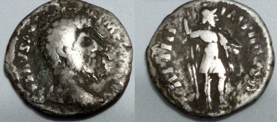 DENAR LEGIONOWY cesarza Septymiusza Sewera. Moneta została prawdopodobnie wybita w 193r. n.e., w Rzymie, a na jej rewersie widzimy orła legionowego (aquila) między dwoma sztandarami wojskowymi – znakami legionowymi.