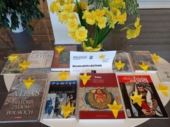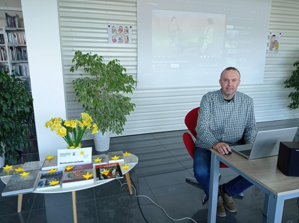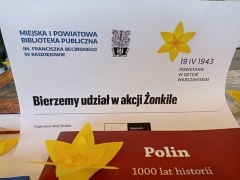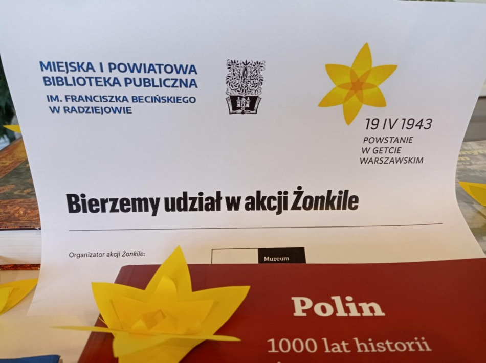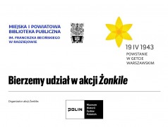 Biblioteka dołączyła do akcji społeczno - edukacyjnej "ŻONKILE" by upamiętnić rocznicę wybuchu powstania w getcie warszawskim. Wraz z uczniami klas siódmych Miejskiego Zespołu Szkół w Radziejowie obejrzeliśmy film edukacyjny pt. "Zdążyć przed Panem Bogiem" – historia Marka Edelmana na tle powstania w getcie i jego późniejszej działalności, wysłuchaliśmy także wykładu o historii radziejowskiej społeczności żydowskiej. Spotkaniu towarzyszyła wystawa książek związana z tematem Powstania w Getcie Warszawskim.