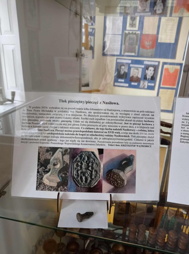 W grudniu 2025 r. wybrałem się na poszukiwania kilka kilometrów od Radziejowa, a mianowicie na pole należące do Pana Piotra Michalaka w pobliskiej wsi Nasiłowo, nie spodziewałem się, że wyciągnę z ziemi zabytek tak bezpośrednio, namacalnie związaną z tym miejscem. Znalazłem tłok pieczętny/pieczęć herbową z herbem Pomian. Widoczna na niej jest głowa Żubra przeszyta od góry mieczem w prawo skos, a w klejnocie nad herbem w koronie ramię zbrojne z takimże mieczem. Co ciekawe, do tego herbu należeli Nasiłowscy, czyli rodzina, która była właścicielami Nasiłowa. Pieczęć można prawdopodobnie datować na XVII wiek, a więc ma około 350 lat, może nawet nieco więcej i prawdopodobnie należała do kogoś ze szlacheckiej rodziny Nasiłowskich. Tłok pieczętny służył do stemplowania różnego rodzaju dokumentów/korespondencji, pism aby je zabezpieczyć/uwiarygodnić. Ciekawe w jakich okolicznościach został zgubiony - tego już nigdy się nie dowiemy. Powyższy zabytek został znaleziony w ramach prowadzonego przeze mnie projektu poszukiwań pt. „Taka historia raDZIEJÓW”.