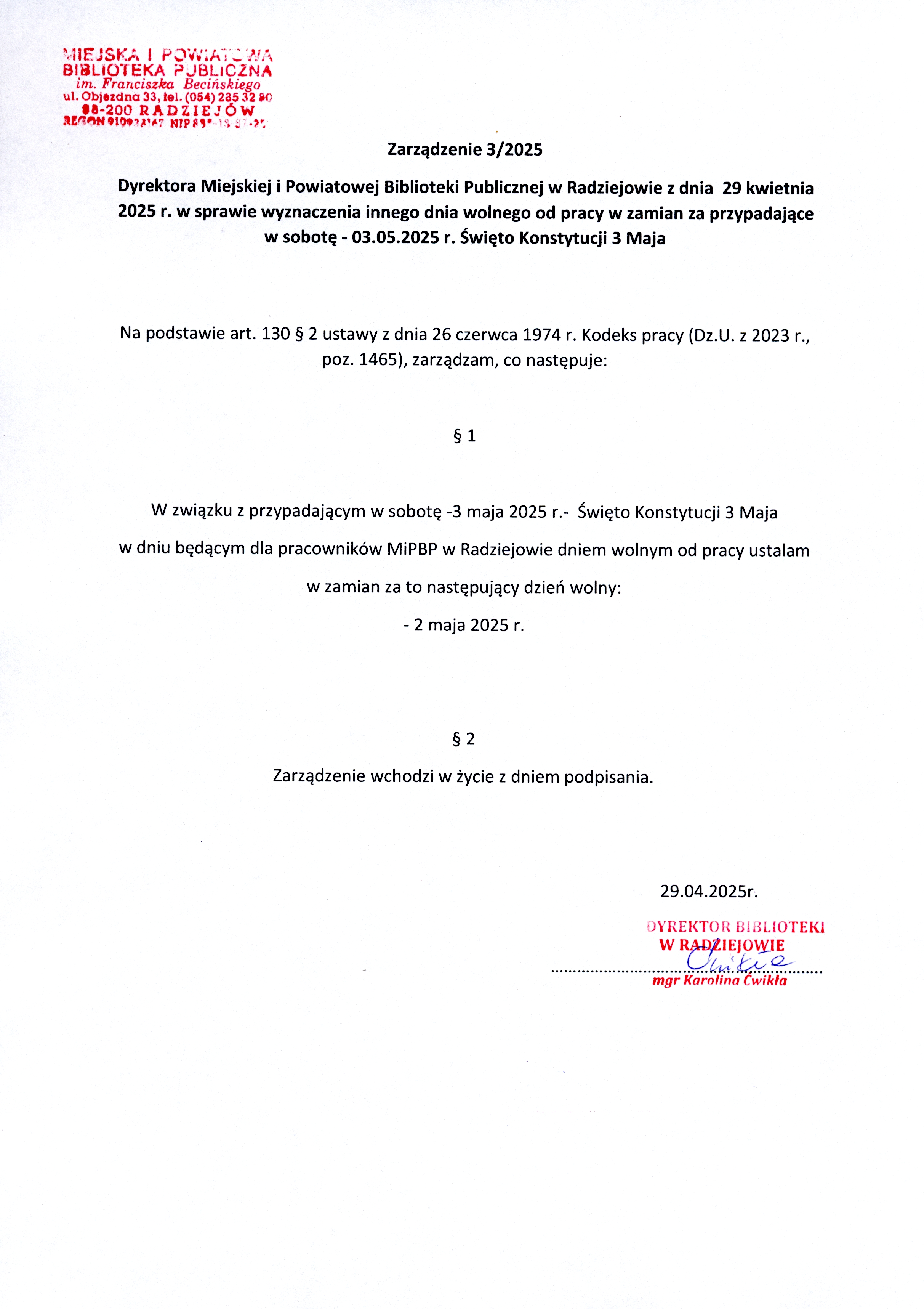 Zarządzenie 3/2025 Dyrektora Miejskiej i Powiatowej Biblioteki Publicznej w Radziejowie z dnia 29 kwietnia 2025r. w sprawie wyznaczenia innego dnia wolnego od pracy w zamian za przypadające w sobotęZarzadzenie_nr_3_-_2025.jpg